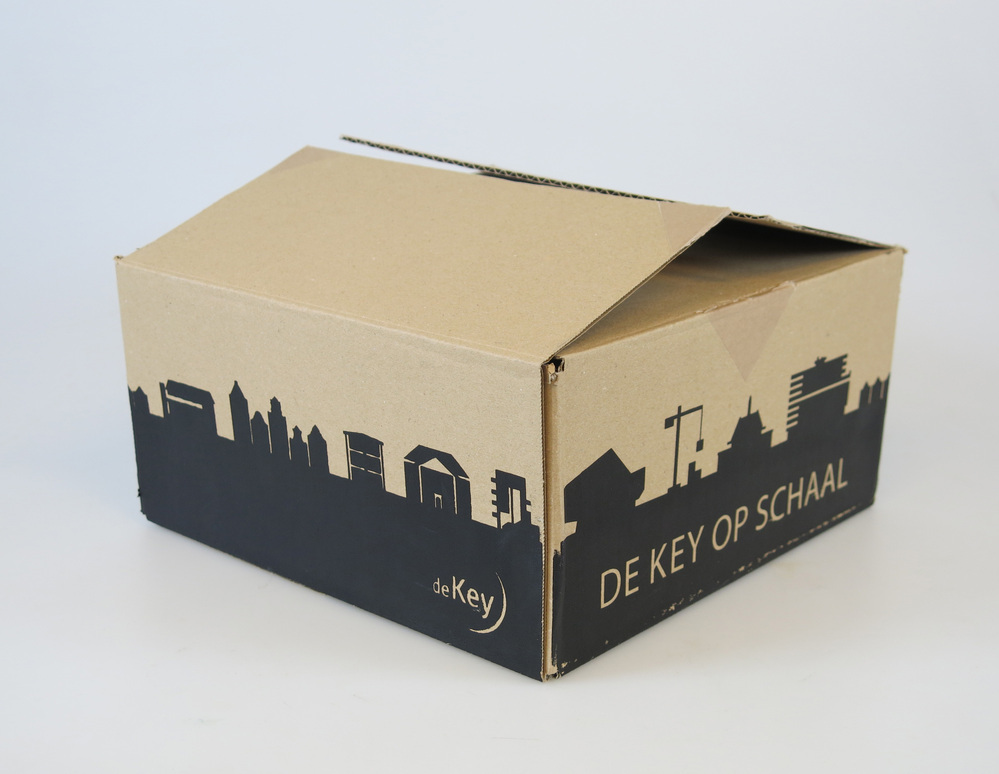 Doos van 150 jaar De Key op Schaal, 2018 karton hoogte: 13.5 cm; breedte: 25.3 cm; diepte: 25.7 cm; opdruk zijkant: 1868-2018/ DE KEY OP SCHAAL/ DE KEY
