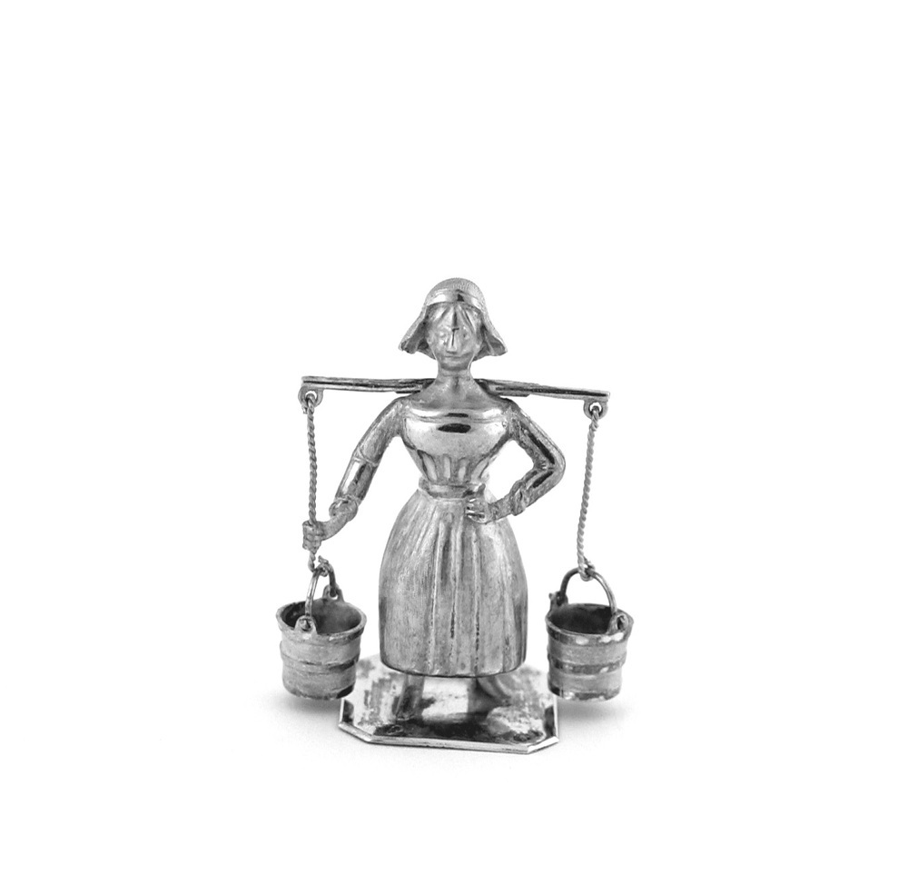 Vrouw in Friese klederdracht met een juk waaraan twee emmers