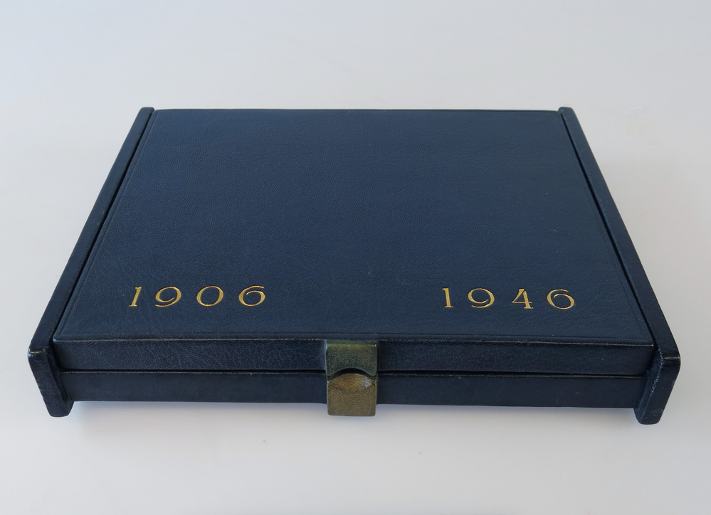 Doos voor erepenning van de Vereniging "Bouwmaatschappij tot verkrijging van Eigen Woningen", uitgereikt aan Mr. Jan Kruseman (1865-1949) ter gelegenheid van zijn 40-jarig jubileum als lid en voorzitter van de Commissie van Toezicht 1906-1946, incl. oorkonde, 1946
