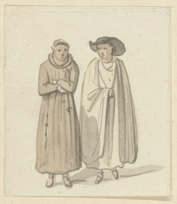 Daniël Dupré (1751-1817) tekende tijdens zijn verblijf in Italië niet alleen landschappen en studies voor prenten, maar maakte ook kleine schetsjes zoals deze. De zes tekeningetjes laten elk één of twee figuren zien, in verschillende kledij. Op deze tekening is links een monnik te zien, die gezien zijn haardracht en bruine pij van een Franciscaanse orde deel uit zal maken. Het koord om zijn middel, met drie knopen erin en de lange driehoekige capuchon (deze is te zien op een andere tekening van dit duo, zie TA 18395.3) plaatsen hem bij de Capucijner Orde. Naast hem staat een man in een witte mantel, met een grote zwarte hoed op het hoofd. Een wapen dat op de andere tekening op diens rug te zien is identificeert hem als lid van de Trinitariërs, een katholieke bedelorde.
