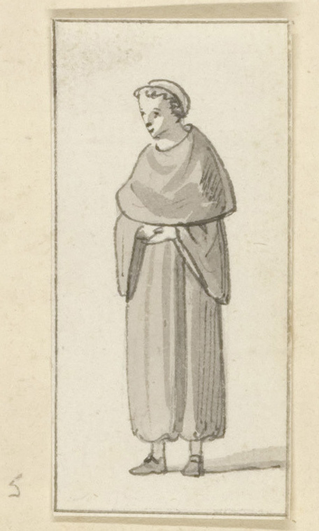 - Catalogus tekeningen AHM 1999Deze monnik, met ineengeslagen handen en een vriendelijke glimlach, draagt een ander habijt dan die op Daniël Dupré’s (1751-1817) andere tekeningen (zie TA 18395.1-4). De mouwen van deze pij lopen wijd uit en om de schouders is een capuche geslagen. ( Nina Reid)