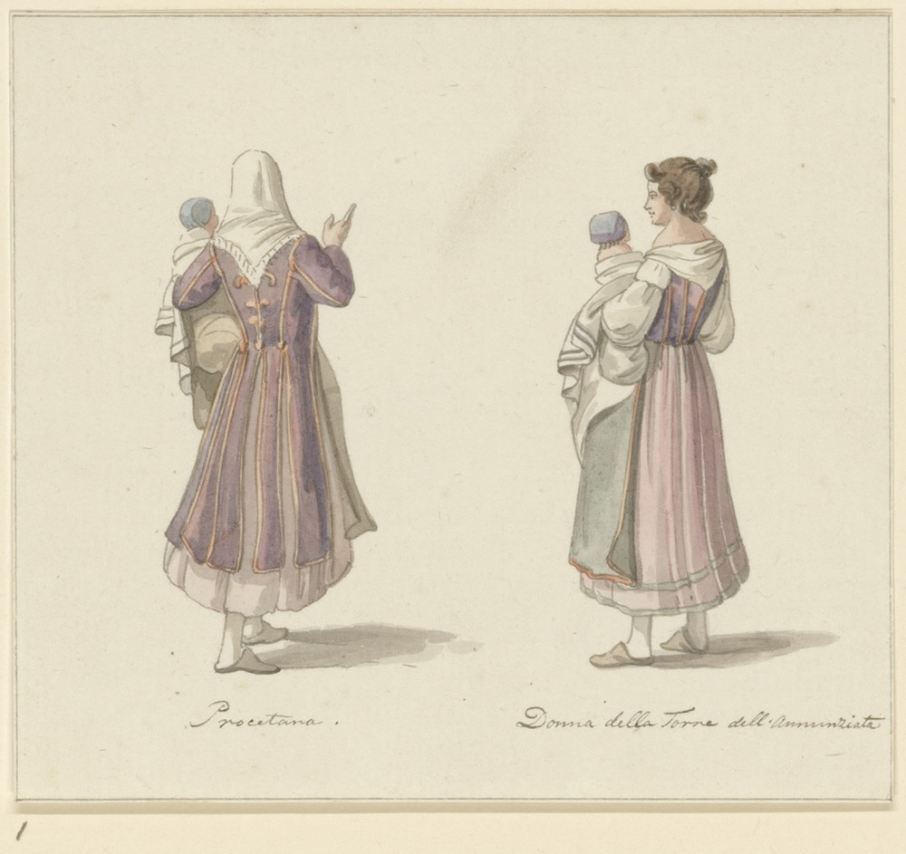 Dupré tekende in Italië voornamelijk veel landschappen, die hij in sommige gevallen als gravure verspreidde. Het is goed mogelijk dat hij ook vellen als dit naar Nederland stuurde, waarop hij de dracht van Italiaanse vrouwen natekende. De twee op dit blad dragen beide een paarse jurk en een kind op de arm. Dit soort figuur- of kostuumstudies, waarop één figuur tegen een witte achtergrond werd afgebeeld met daaronder een kort onderschrift, was populair in Italië; het is dan ook waarschijnlijk dat Dupré deze tekeningen op zijn reis maakte. De onderschriften, Procetana en Donna della Torre dell’Annunziata, duiden er beide op dat deze vrouwen uit Napels komen. Er is een zeer vergelijkbare prent van een Italiaanse vrouw in kostuum bekend, tevens een rugfiguur, met als onderschrift “Procetana, femme d’etats de Naples.’ Procetana komt van Procida, een klein eiland voor de kust van Napels en Torre dell’Annunziata is een stad in de buurt van Napels. Dupré kan ze dus in deze regio gezien en getekend hebben. ( Nina Reid)