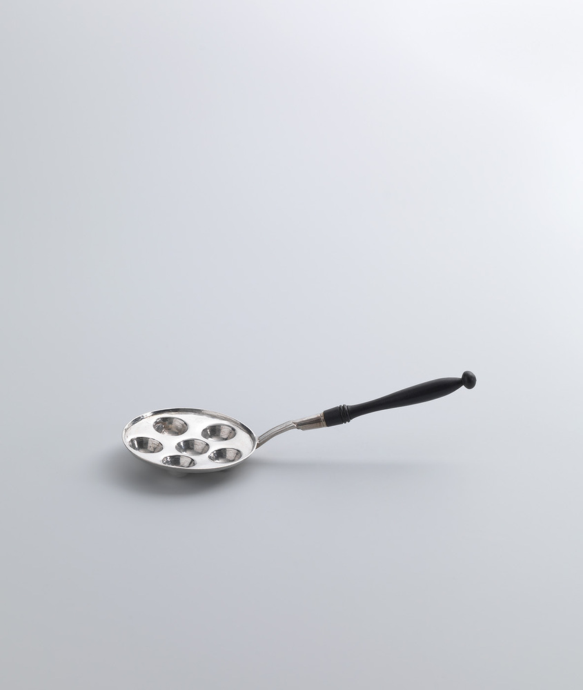 uithollingen, maar ze bestaan ook met drie, vijf of zeven gaten. Een fraai geprofileerde houten steel als bij deze zal in werkelijkheid maar zelden voor zijn gekomen. Voor gebruik in keukens gold: hoe eenvoudiger hoe handiger. ( Bert Vreeken)