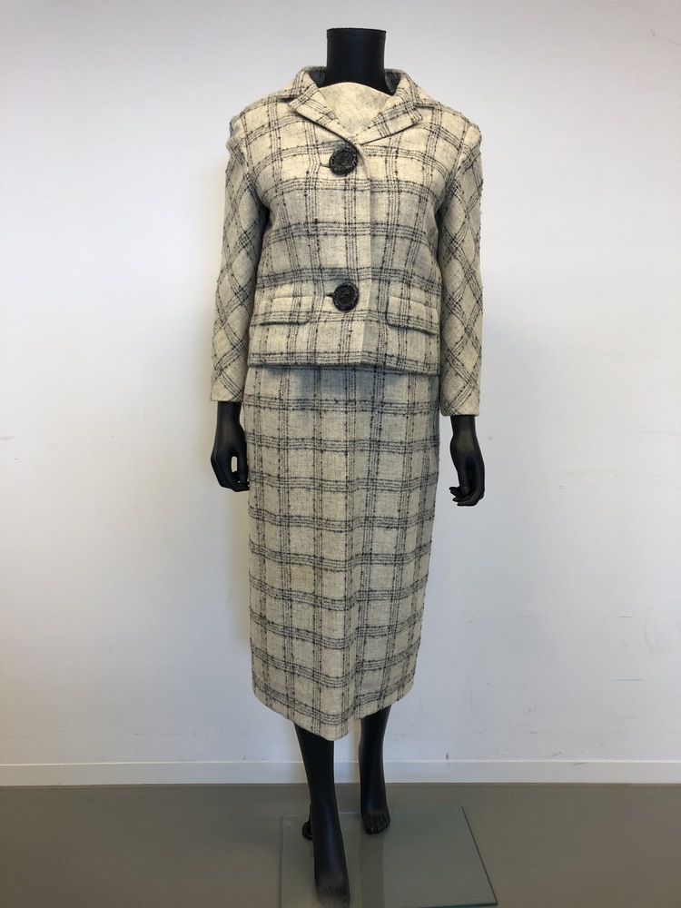 Grijs geruite jurk met jasje en riem.- Trefwoorden