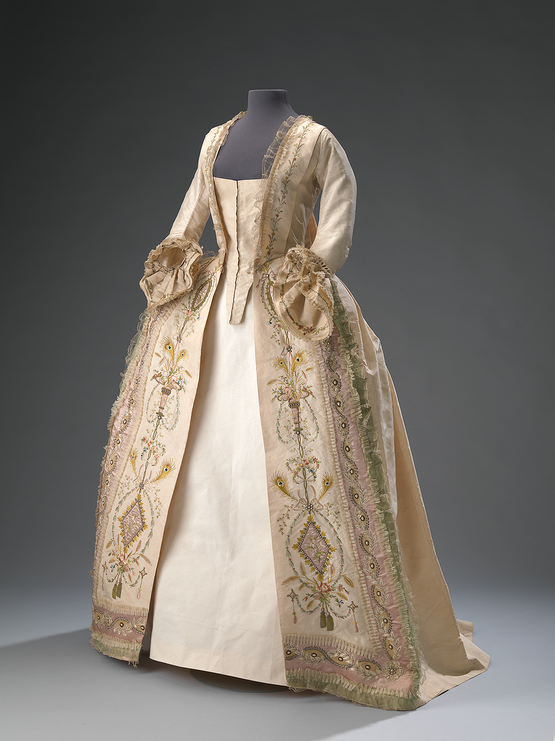 Galajapon van naturelkleurige atlaszijde, bestaande uit een openvallend overkleed en een driehoekig borststuk, de rok ontbreekt. Zogenaamde Robe à la française, dat wil zeggen een losvallende dubbele platte rugplooi, vastgezet in de hals, eindigend in een sleepje. Het lijfje wordt ingesnoerd door middel van een ingenaaid keurslijfje van linnen, vetersluiting middenachter. Het aan het overkleed vastgenaaide borststuk eindigt in een punt onder de taille, sluiting middenvoor door middel van haak en ogen. Het openvallende rokgedeelte is versiertd met een brede geborduurde strook, omboord met een baan lila satijn waarop applicaties zijn aangebracht. Halflange, strakke mouwen eindigend in een gerimpelde dubbele manchet.
