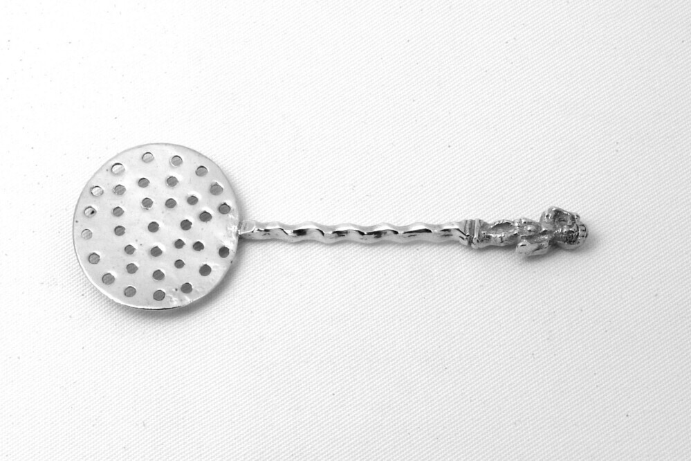 Vlakke plaat met onregelmatig geboorde gaten en getorste steel bekroond met een mansfiguur, saluerend met de rechterhand.- Trefwoorden
