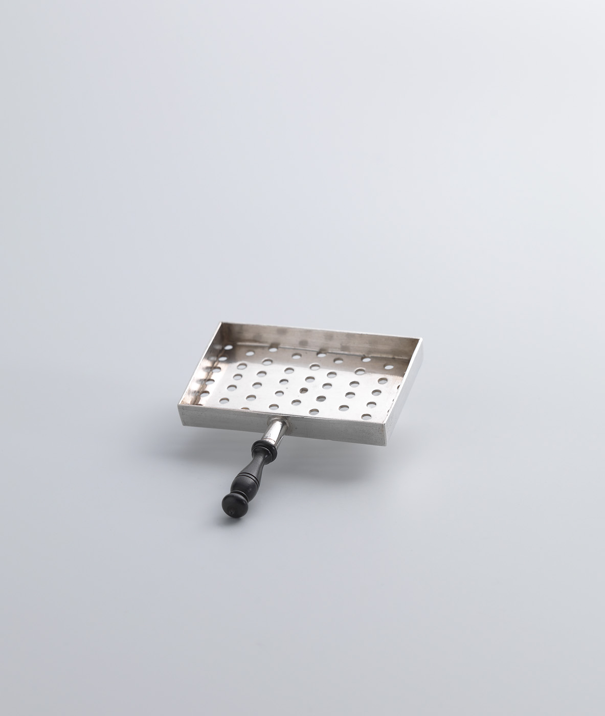 Rechthoekige bak met aangezette bus voor het gedraaide ebbenhouten handvat, de bodem voorzien van 59 gaatjes.