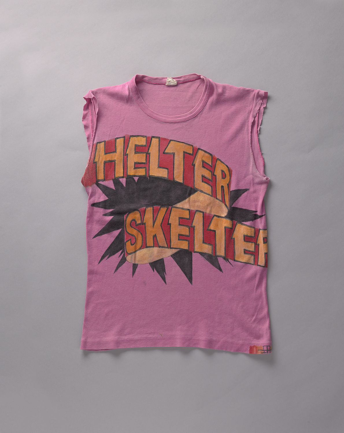 Roze t-shirt met afgeknipte mouwen. Beschilderd met textielverf door Mathilde muPe, tekst 'Helter Skelter' waarbij banier lint doorloopt naar rug.