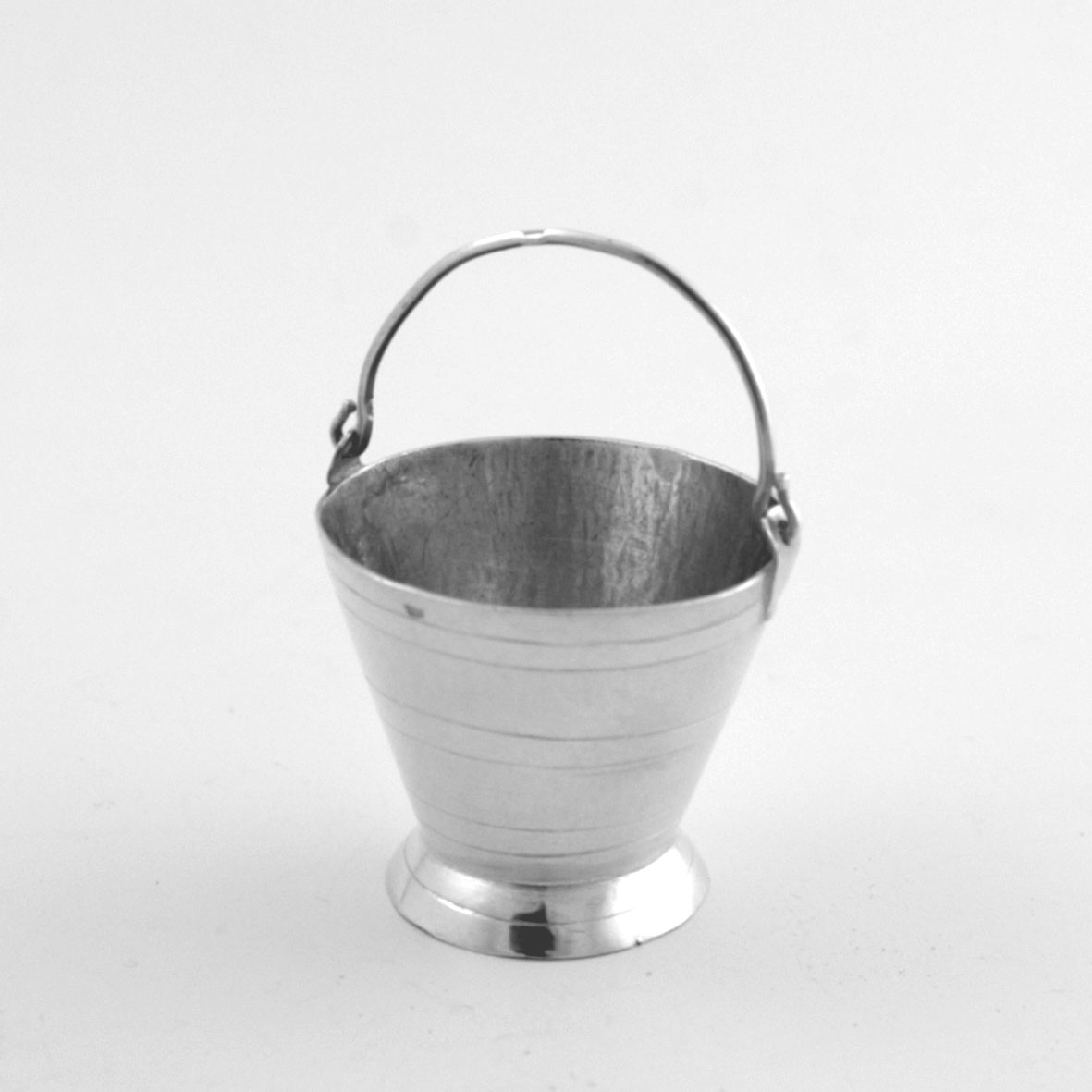 Ronde conische emmer op voetrand, gegraveerde banden die banden imiteren, twee aangezette ogen, waardoor een gebogen hengsel met S-vormige uiteinden.