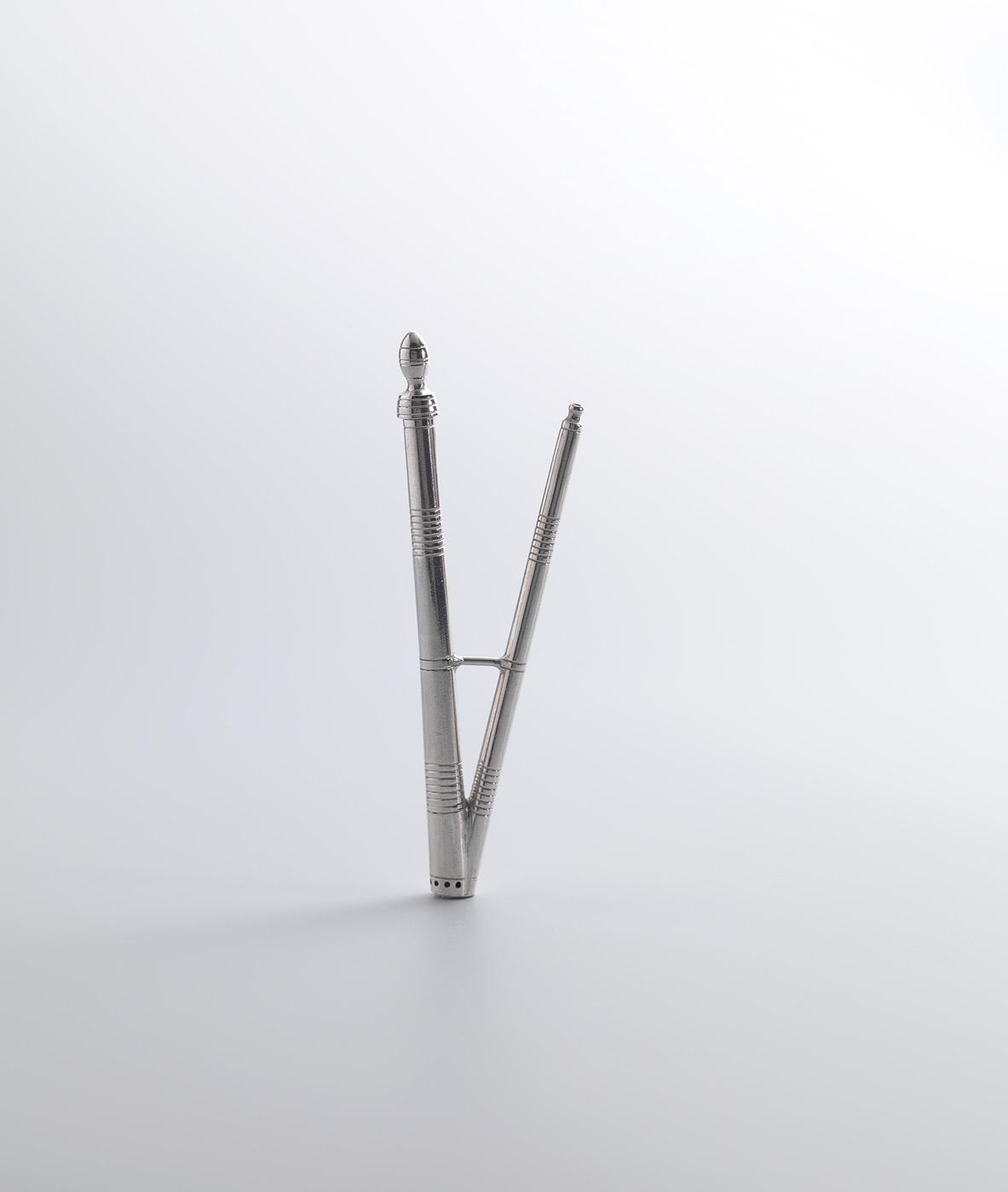 Opgebouwd uit een pompbuis met losse zuiger, aan de onderzijde verbonden met een spuitbuis met spuitmond; de buizen zijn versierd met gegraveerde ringen (telkens 7 ringen); verbindingsstuk tussen beide buizen iets onder de halve hoogte aangebracht.