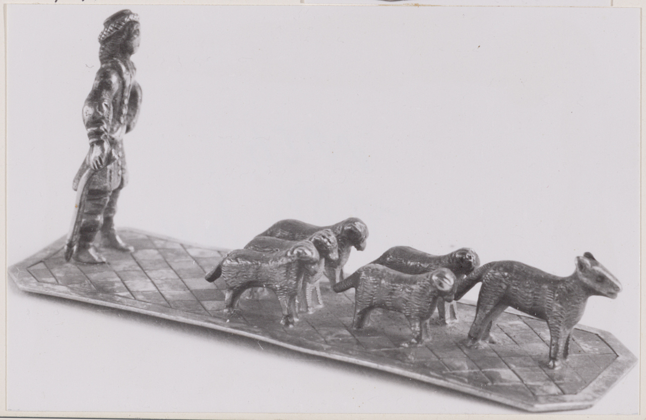 Mansfiguur met vijf schapen vooraf gegaan door een hond, op rechthoekige plaat