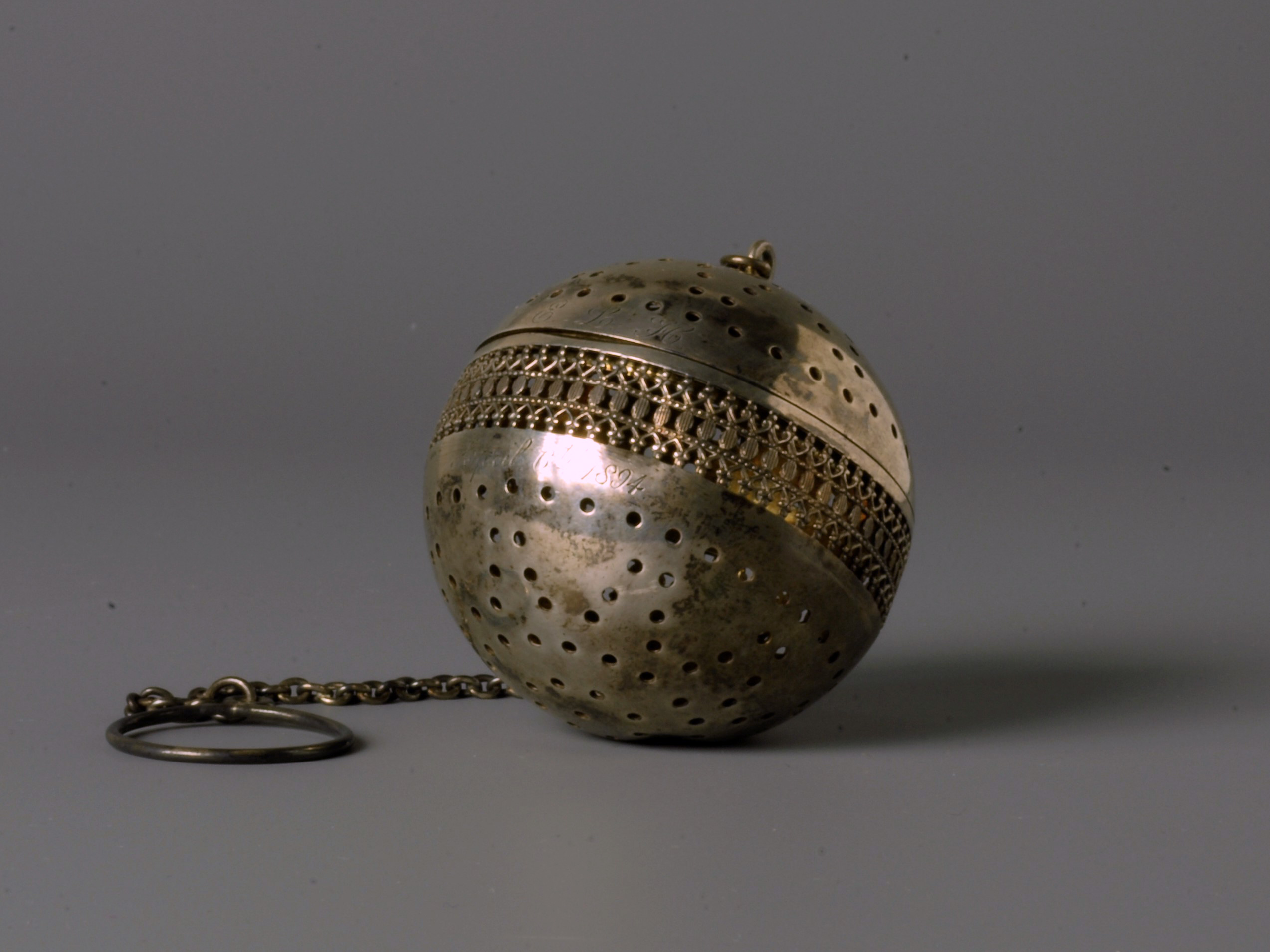 Kogelvormige houder voor thee met een fijn uitgewerkte ajoure rand en gaatjes stervormig geboord, de bol hangend aan een ketting met ring.- Trefwoorden
