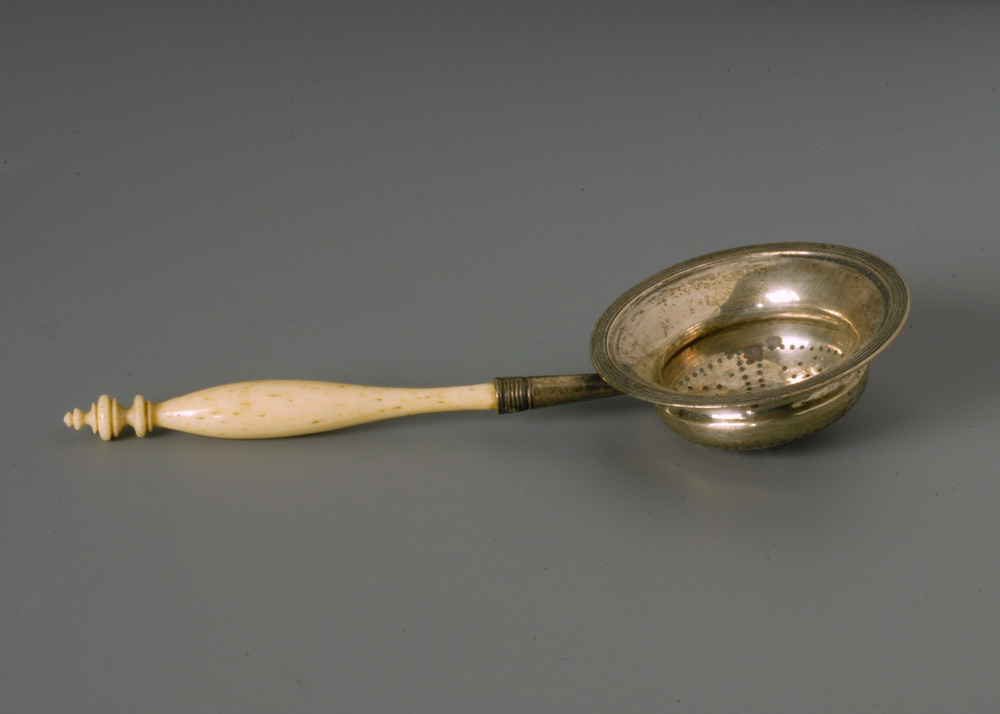 Ronde theezeef met dubbele filetranden de zijde van de bak insnoerend en de bodem geboord in vier halve cirkels, manchet voor de van beengedraaide steel.- Trefwoorden