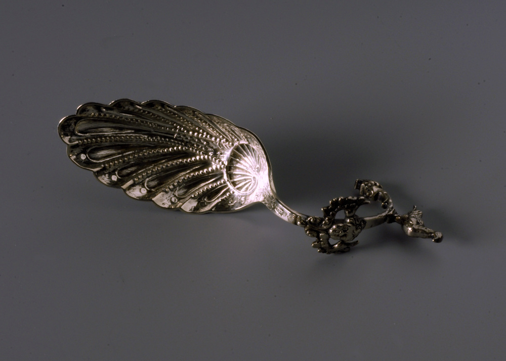 Met knorren gedreven spits ovale bak, korte haaksteel waarop een gegoten schildje met engelenkop, op de haak een duif en het uiteinde heeft een kinderkopje.- Trefwoorden