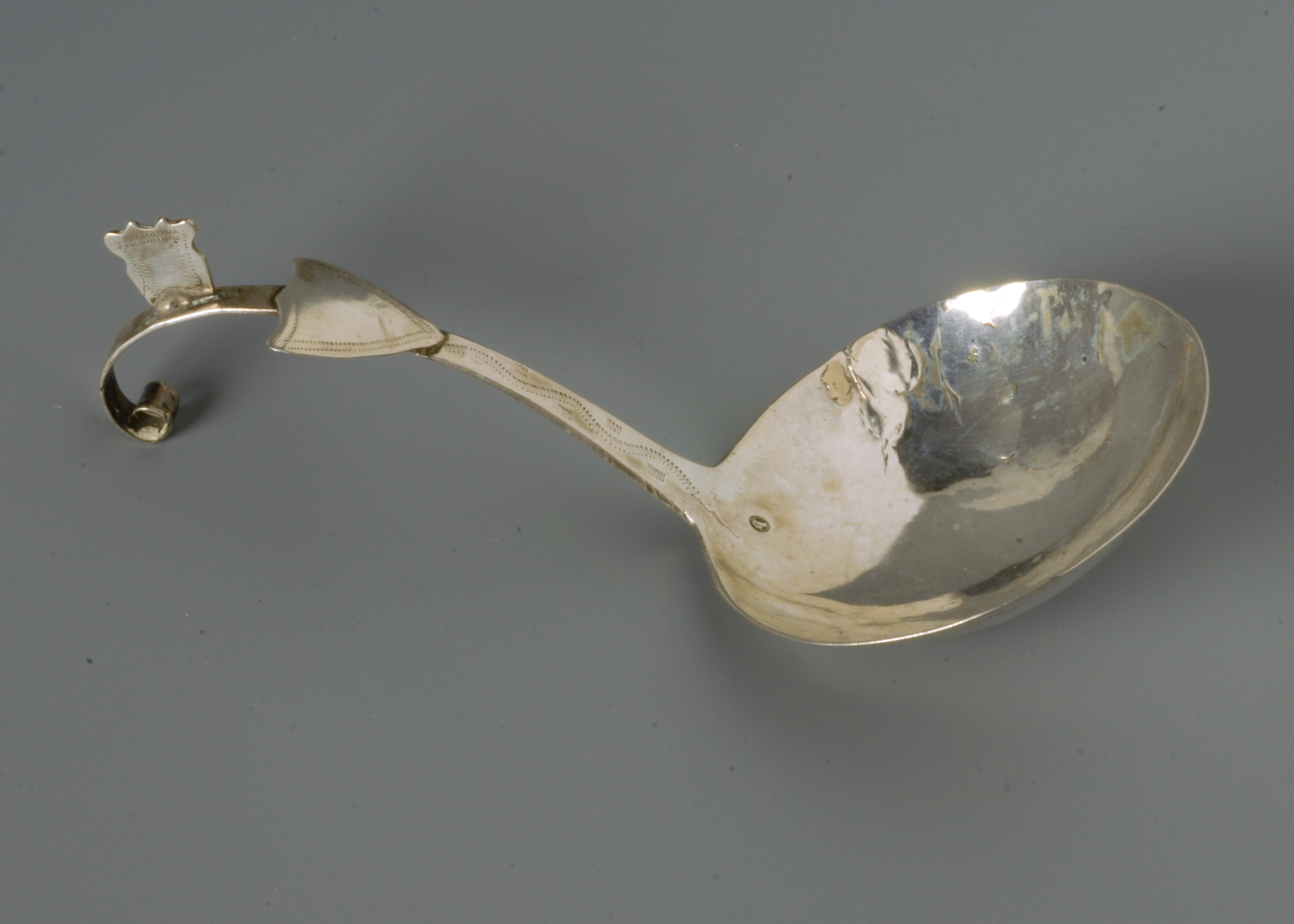 gladde ronde bak met korte haaksteel, glad schildje en een schild op de haak.- Trefwoorden