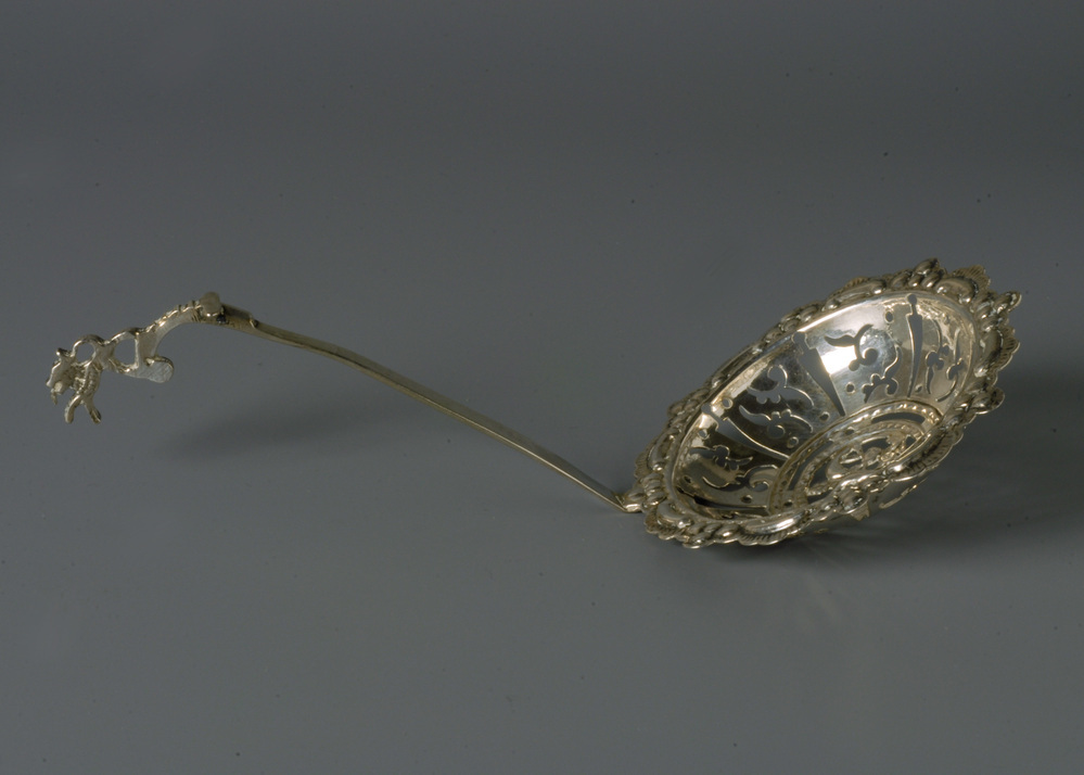 Suikerstrooilepel met ronde bak, ajour gezaagd en haaks aan de steel gezet, rechte steel met aangegoten haak.- Trefwoorden