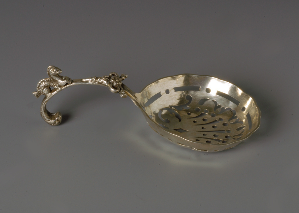 Ronde ajour gezagde bal rand gegolfd, korte gebogen steelwaarop een zeepaard en en gestrikt ornament.- Trefwoorden