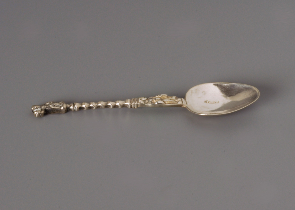 Lepeltje met spits-ovale bak getorste steel op de kop een vaag mensfiguur.- Trefwoorden