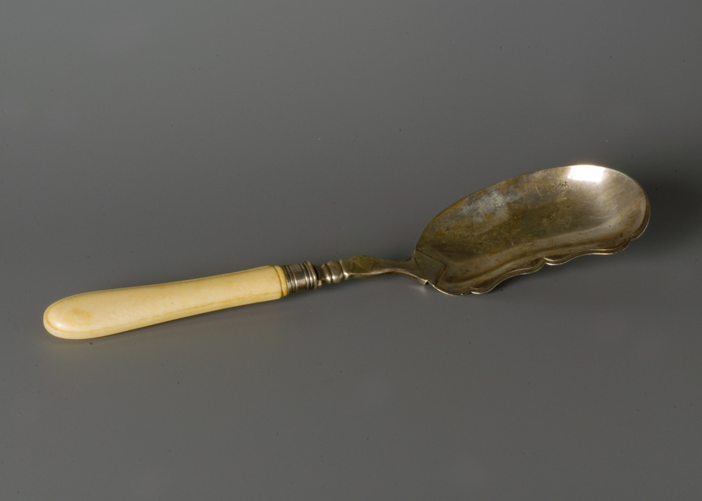 Bak niervormig met accoladerand, gecontourneerde steelaanzet met geribd manchet waarin een ivoren handgreep met een platte- bies profilering. Wttewaaal afb. 631.