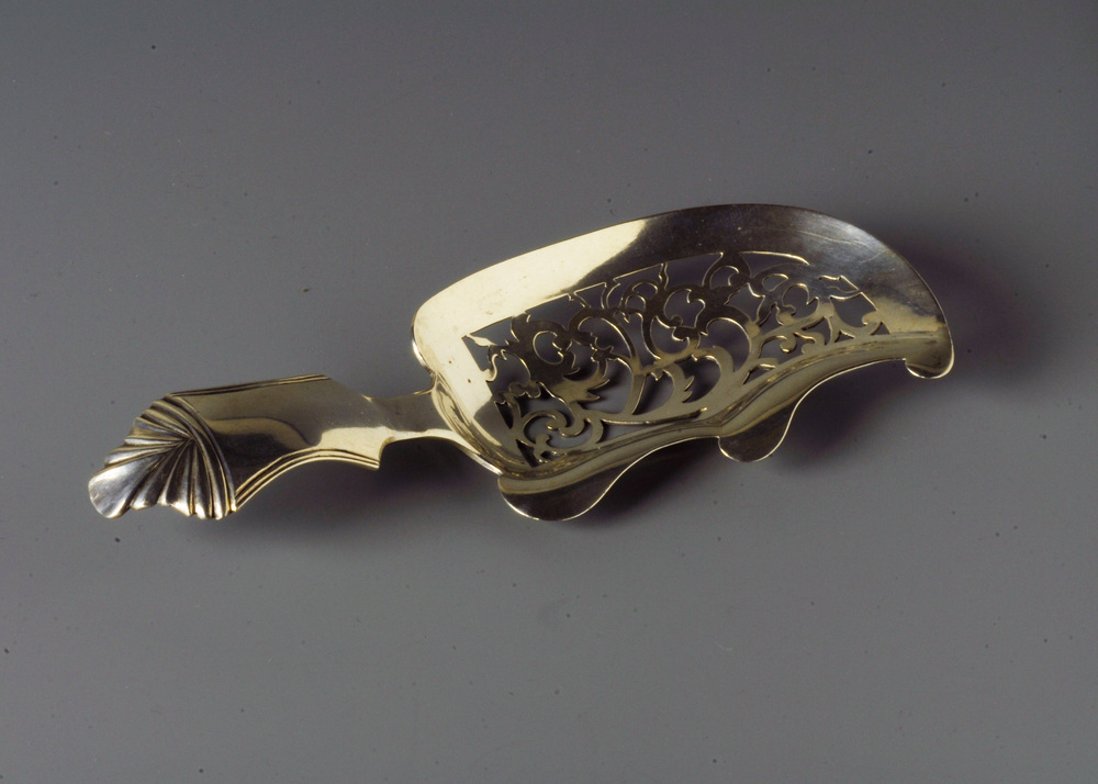 Bak in een half-ovaal , andere zijde met drie golven en bodem ajour gezaagd steel plat gebogen gecontourneerd kop met gestileerde schelp.- Trefwoorden