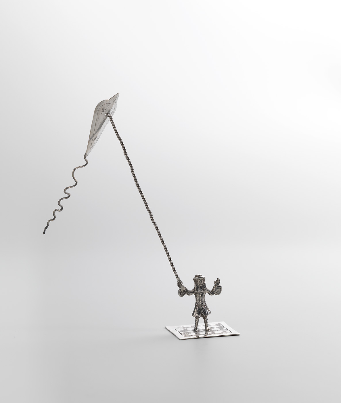 Vliegeren is een spel dat al eeuwenlang in verschillende culturen wordt beoefend. De vliegeraar probeert zijn van lichte materialen gemaakte constructie aan een lange draad zo lang mogelijk in de lucht te houden. Het ventje met zijn vlieger in deze miniatuur brengt de actie mooi in beeld. Vliegers waren veelal zelfgemaakt en mooi versierd. Er bestonden zelfs speciale knipprenten die op de vlieger konden worden geplakt. Mogelijk verwijzen de sterretjes op deze zilveren vlieger ook naar een dergelijke versiering. ( Bert Vreeken)