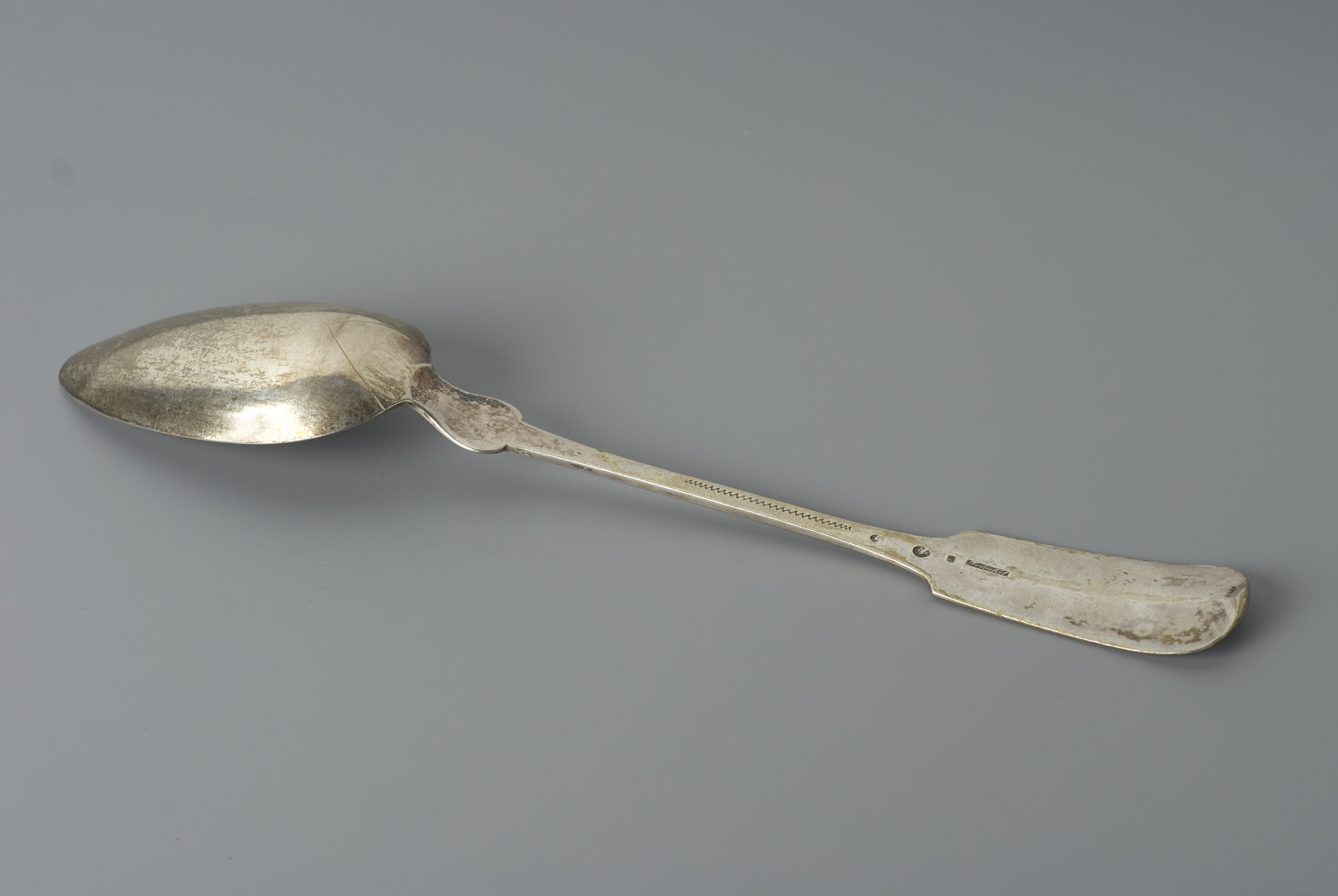 Lepel met puntig ovale bak, steel met afgeronde kop en dubbel spits lof en midden rib opp de onderzijde .- Trefwoorden
