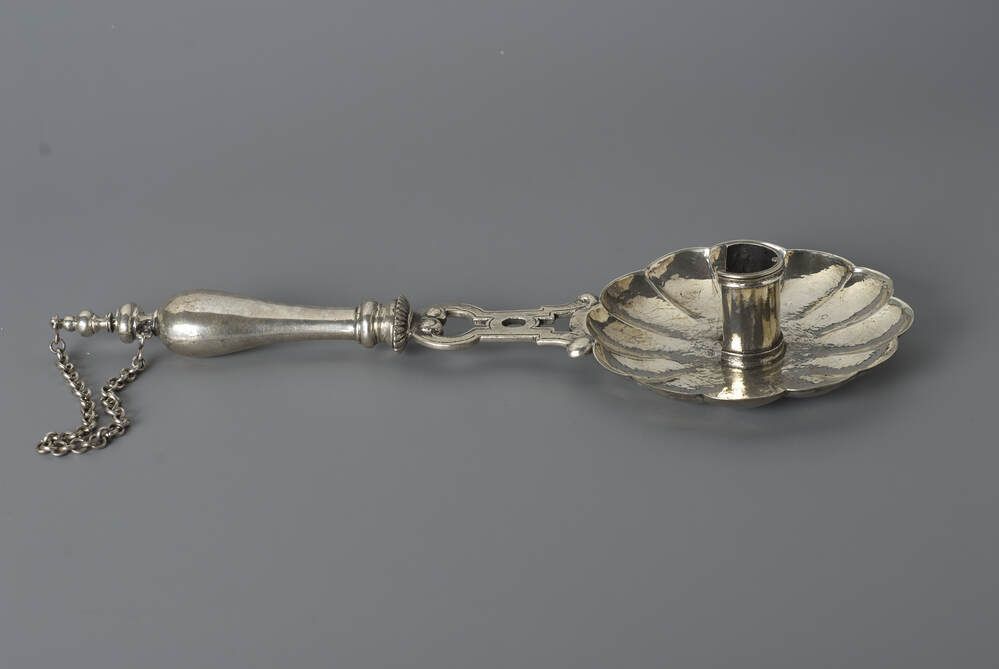 Bloemvormigblad met kaarsenhouder, H vormige steel aanzet met ronde greep bekroond met draaiwerk, aan ketting zit kaarsendover die in de greep geschoven zit,- Trefwoorden
