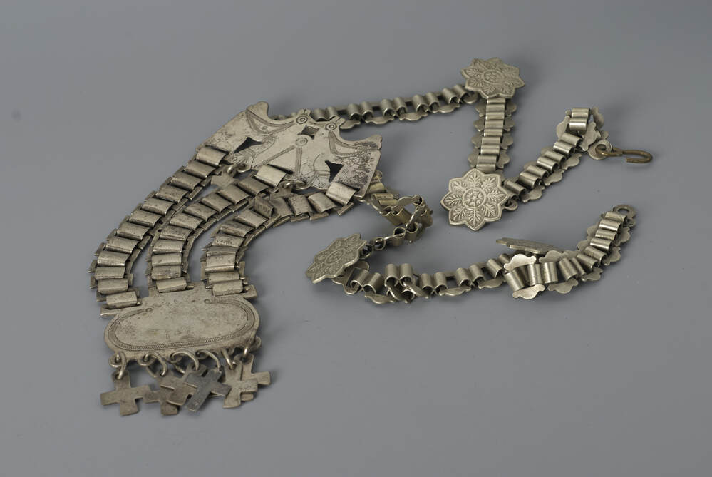 Halsketting met bloemvormige ornamenten,,waaraan een breed deel met drie ketting strengen op een plat ovaal versierd met6 kruisvormige ornamenten aan een oog.- Trefwoorden
