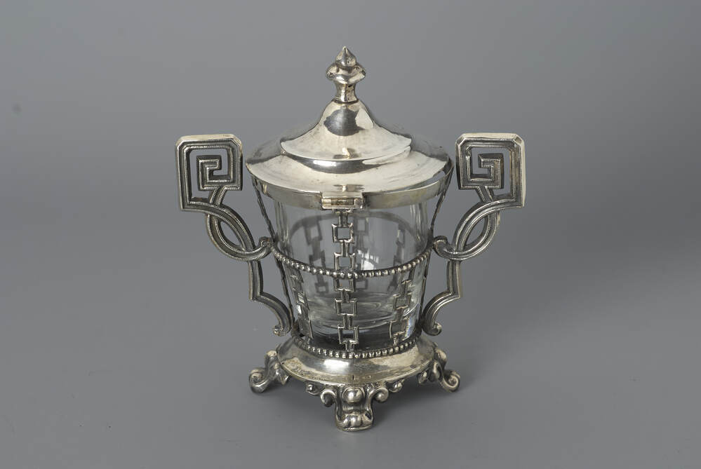 Ronde zilveren houder met twee oren en scharnierend deksel in een neo size stijl, staand op vier pootjes, origineel glas ontbreekt.- Trefwoorden
