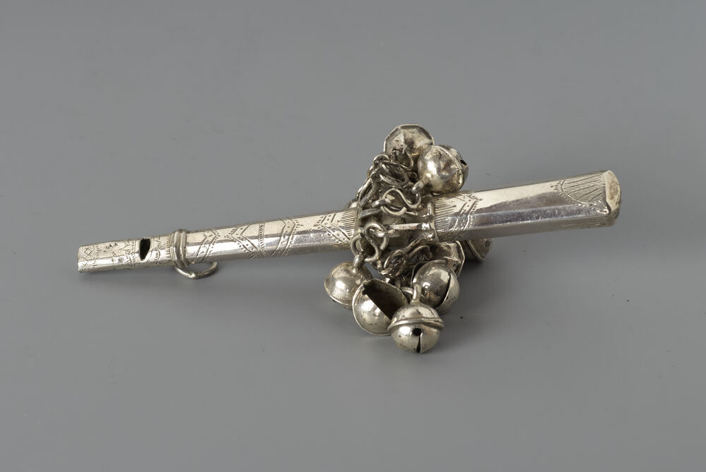 Zilveren rammelaar met fluitje en 12 belletjes- Trefwoorden