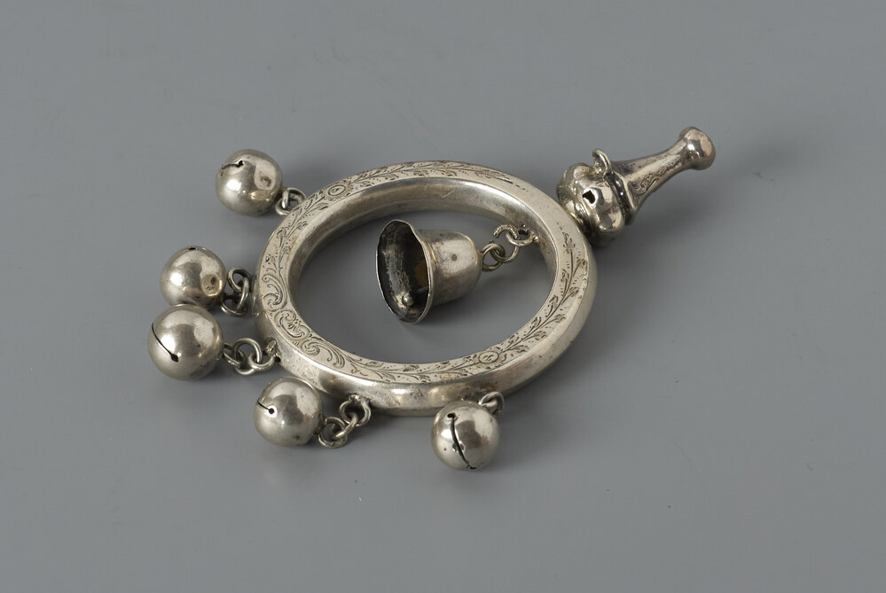 Zilveren rammelaar in de vorm van een bijtring met vijfbelletjes, klokje en eenfluit.- Trefwoorden