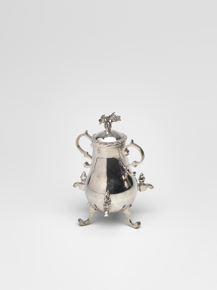 Kraantjeskan op drie pootjes, voorzien van drie kraantjes, twee S-vormige oren, los deksel met gecontourneerde en gegraveerde rand; de dekselknop gevormd uit bloembouquet.
