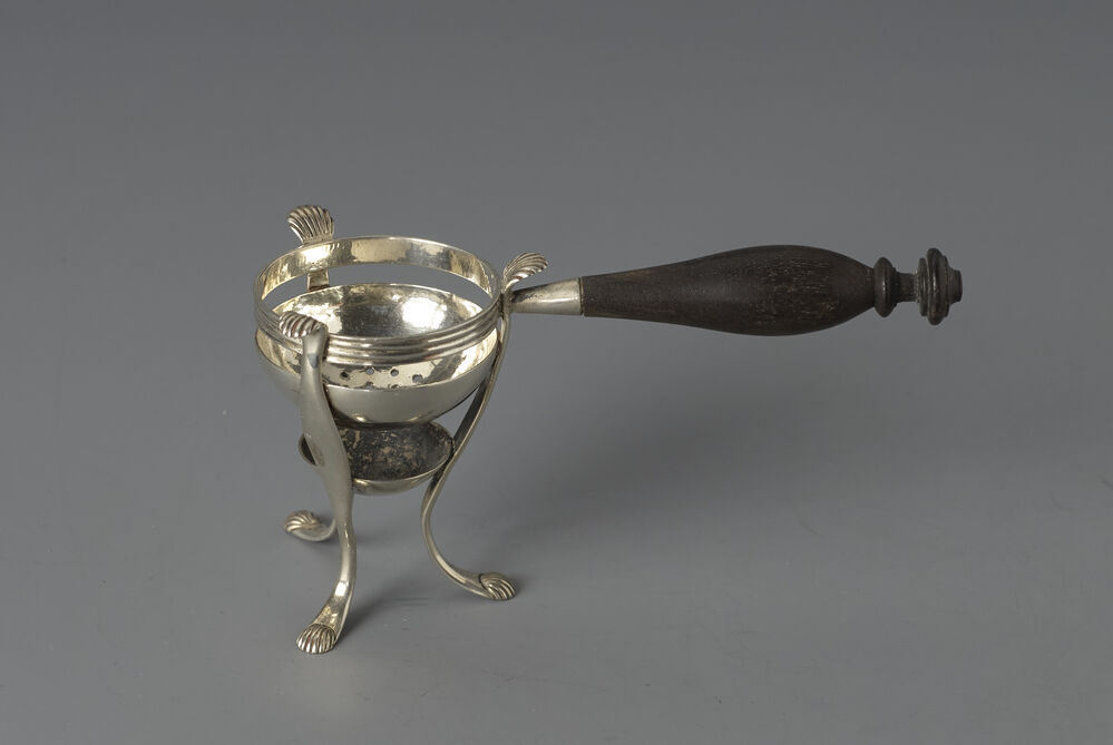 Ronde pijpenkomfoor op driepoot met ebbenhouten geprofileerd handvat- Trefwoorden