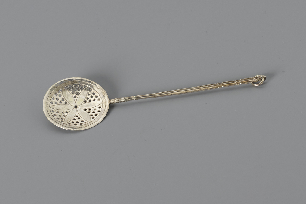 Lichtgewelfde ronde bak met gaatjes en gestileerde bloemblaadjes, lange geprofileerde steel met puntige aanzet en ophangoog.- Trefwoorden