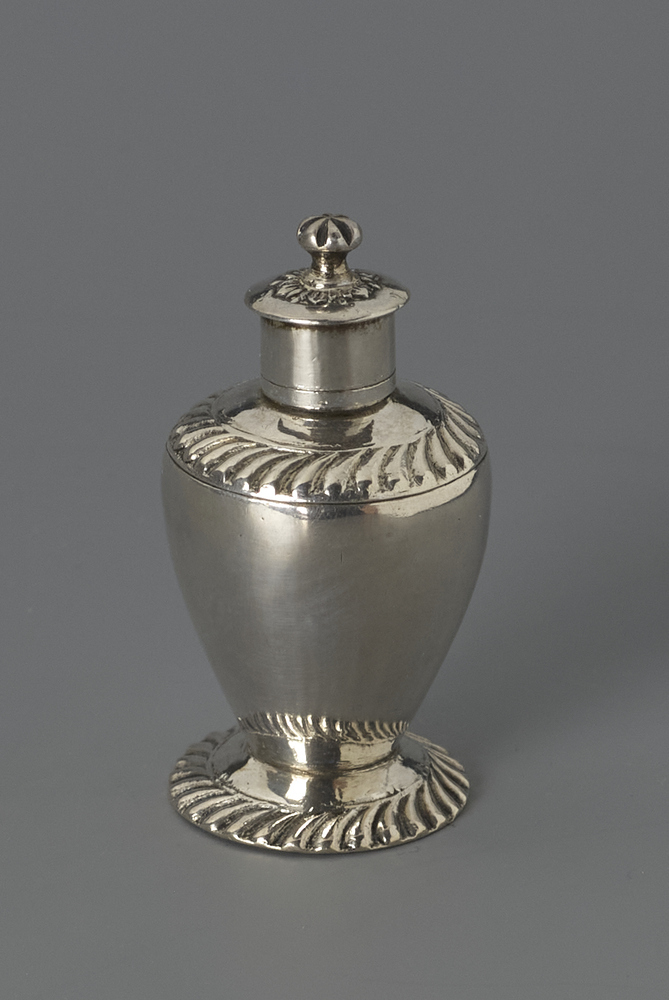 De theebus heeft een rond, uitstaande rand en een vassvormig lichaam. De voet en de schouder van de bus is versierd met een knorlijst.- Trefwoorden