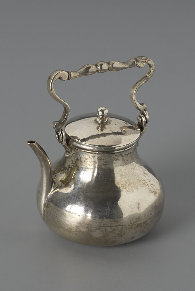 Ketel met bolle buik insnoerend naar de bovenzijde waarop een flauw gebogen vlakke deksel, lange F vormige tuit, scharnierend hengsel, twee S-vormen met een versierde midden greep.
