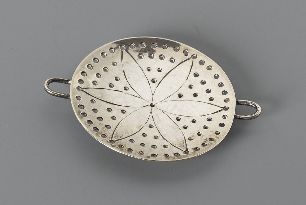Rond vergiet met twee oren aan de licht gebogen plaat, staande op drie pootjes, met op de bovenzijde een bloemblad gravering .