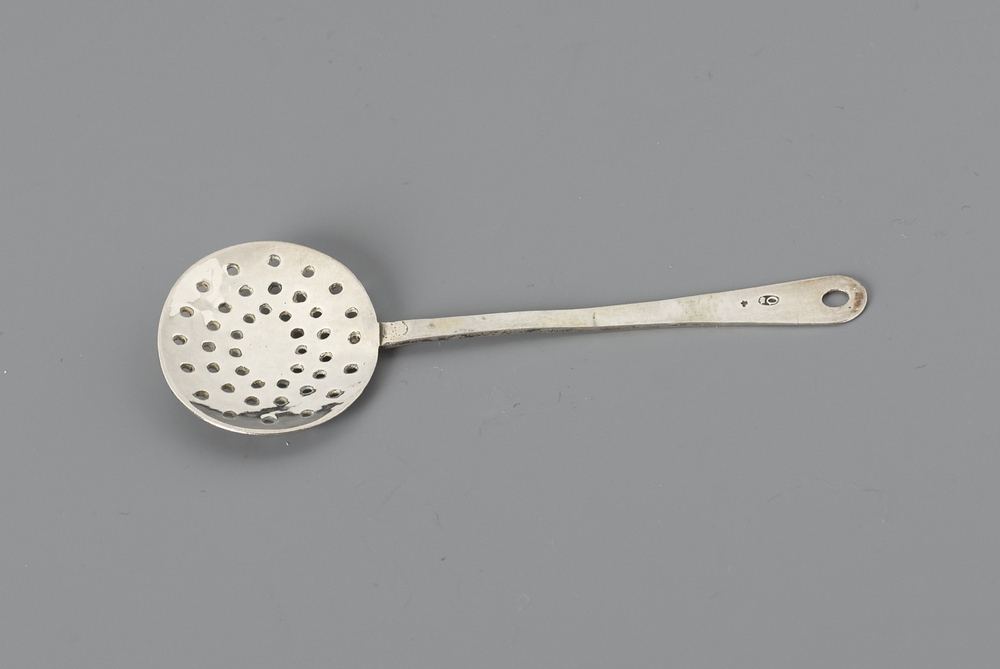 Lichtgewelfde ovale bak met gaatjes in drie cirkels, taps toelopende steel met puntige aanzet, uiteinde met ophangoog.- Trefwoorden