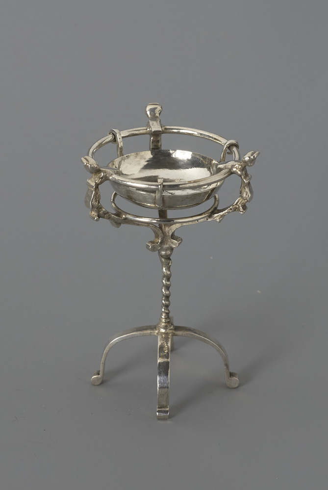 Standaard op een gedraaide stam, die uitloopt in een vierpoot. Op de stam komen vier geprofileerde armen samen die twee draagringen steunen.