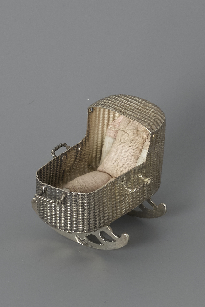 Wieg in de vorm van een mand, met vier grepen en een halfronde kap.- Trefwoorden