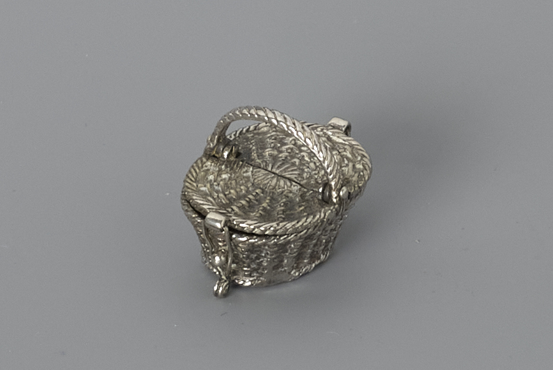 Lodereindoosje in de vorm van een ovalen sluitmand van gevlochten zilverdraad, met twee scharnierende deskels en een handvat.- Trefwoorden