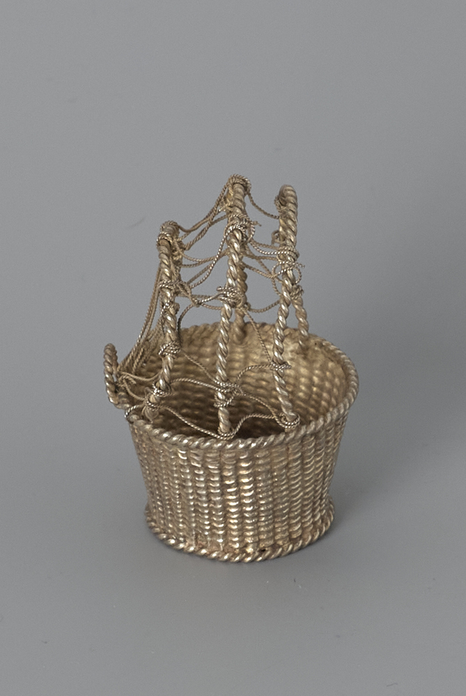 Ronde vuurmand van gevlochten zilverdraad. De mand staat op een voet en heeft een handvat. Over de mand zijn twee spangen gespannen.- Trefwoorden