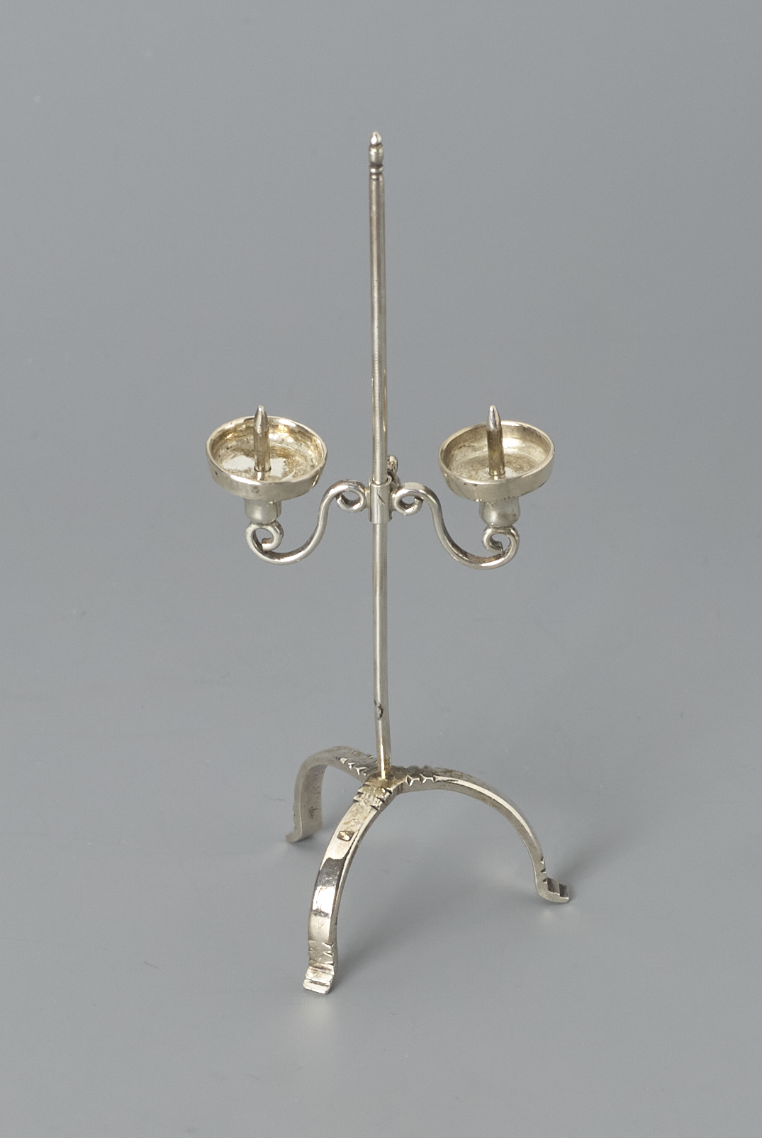 In hoogte verstelbare kaarsenhouder voor twee kaarsen op een driepoot.- Trefwoorden