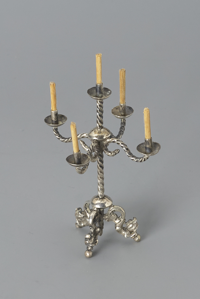 Vierarmige kandelaber met getorste armen op een driepoot.- Trefwoorden