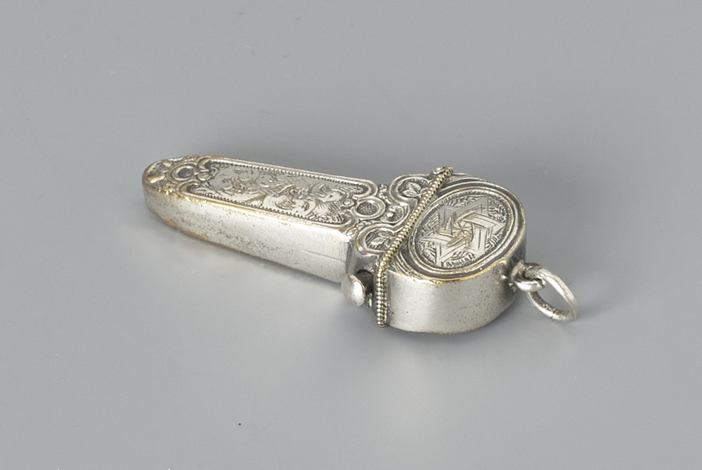 Scharenkoker voor een opvouwbare schaar, gegraveerd met ranken aan een ring- Trefwoorden