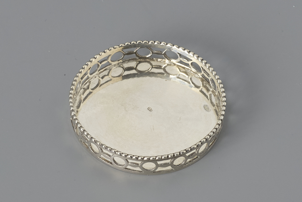 Ronde flessenbak met opengewerkte rand en parelrand.