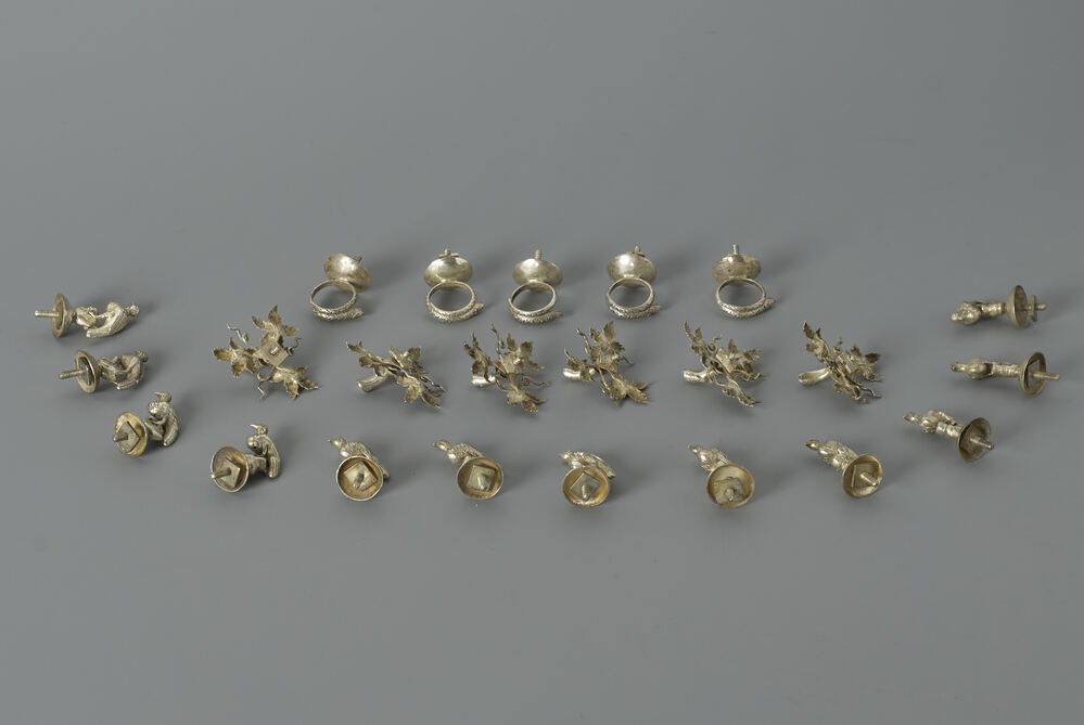 6 slangen, 6 tak ornamenten met elk drie balderen, 12 vogels staand op een rots, alle ornamenten identiek aan elkaar.- Trefwoorden