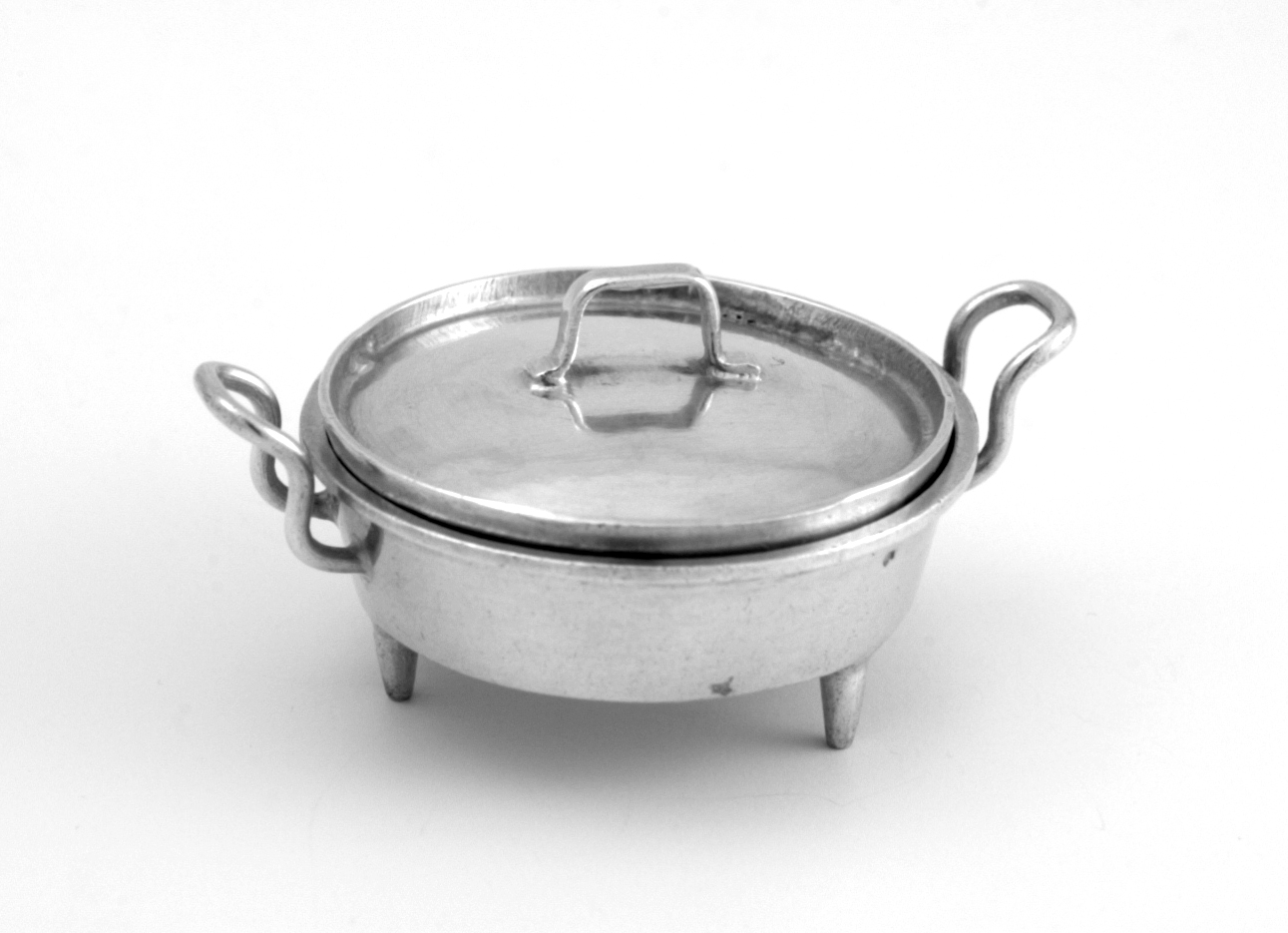 Ronde braadpan staande op drie rechte pootjes, vlakke wand en bodem en verbrede bovenrand; twee U- en S-vormig aangezette oren, los licht gebogen deksel met U-vormig handvat en conisch gezette sluitrand.