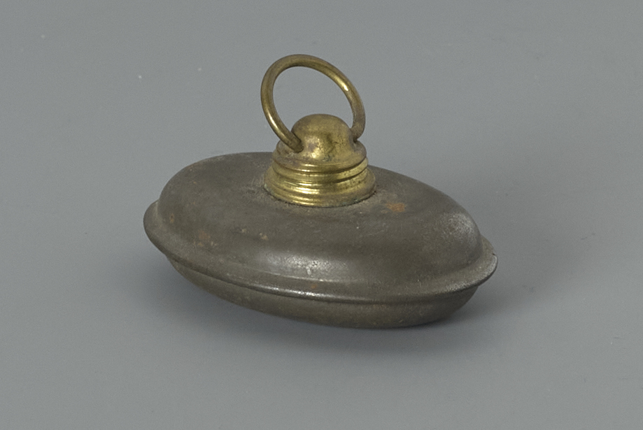 Ovale zinken poppenkruik met koperkleurige dop met ring- Trefwoorden