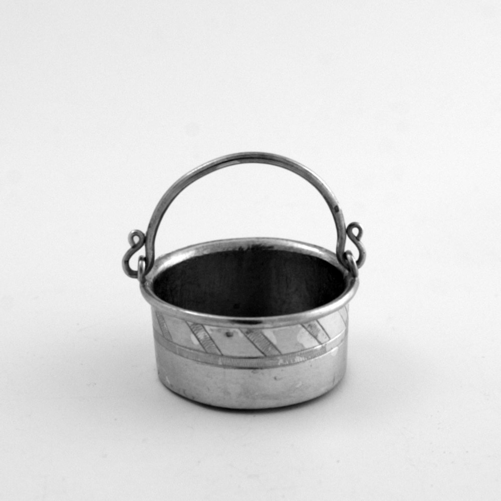 Ronde pot met licht gewelfde bodem, cilindrische wand met bovenste helft diagonale en op het midden een enkele bandgravering, velsrand waaraan twee ogen met gebogen hengsel met S-vormige uiteinden.